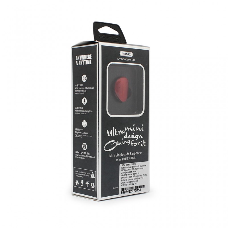 Bluetooth slusalica REMAX mini RB-T21 crvena prodaja po AKCIJSKOJ ceni 4000 dinara u Beogradu i Srbiji. Originalno fabričko pakovanje Bluetooth slusalica REMAX mini RB-T21 crvena. Isporuka po Srbiji za 24h. Poručite telefonom ili online - telekoplus.com