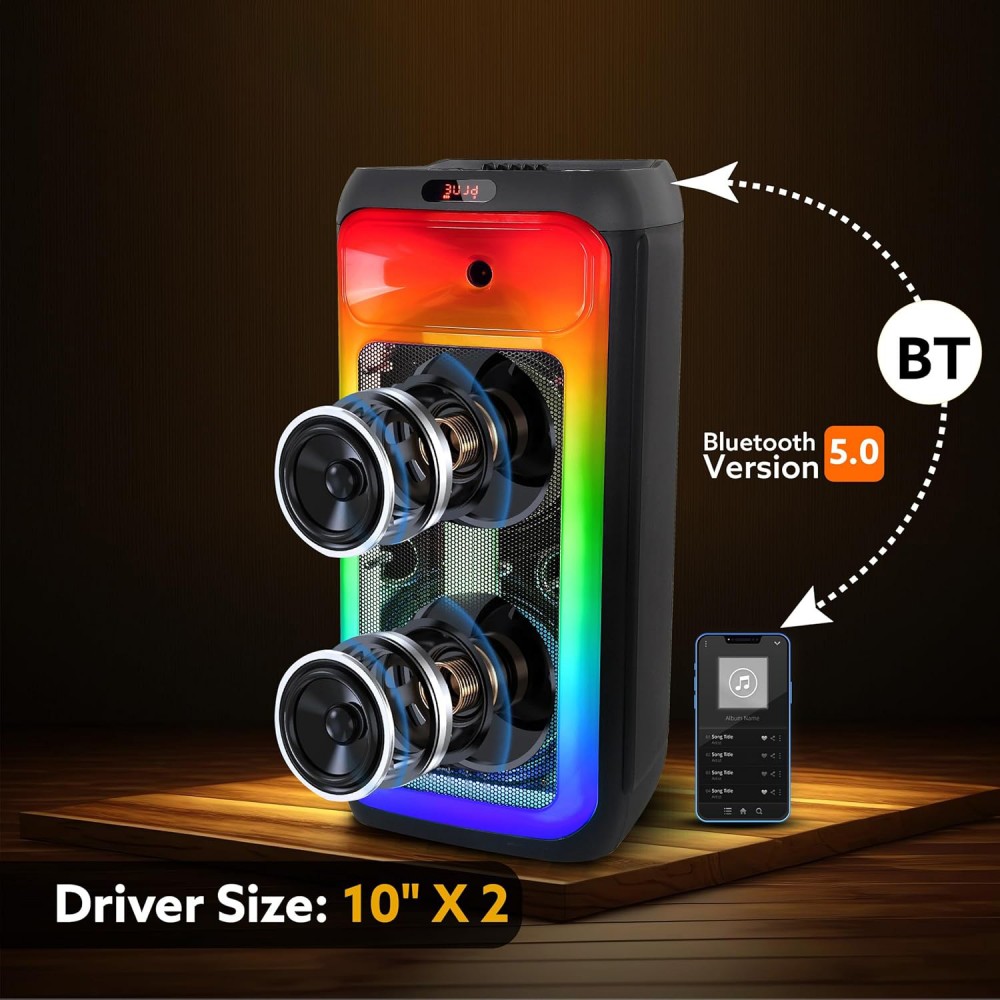 Visokokvalitetno audio iskustvo: DR-1028 dvostruki 10-inčni Hi-Fi sistem pruža izvanrednu audio izvedbu sa svojim 2.0 kanalom i bežičnim zvučničkim mogućnostima. Savršen za žurke, sadrži ugrađeni mikrofon za karaoke i podržava razne muzičke servise kao što su Spotify, Apple Music i Pandora.