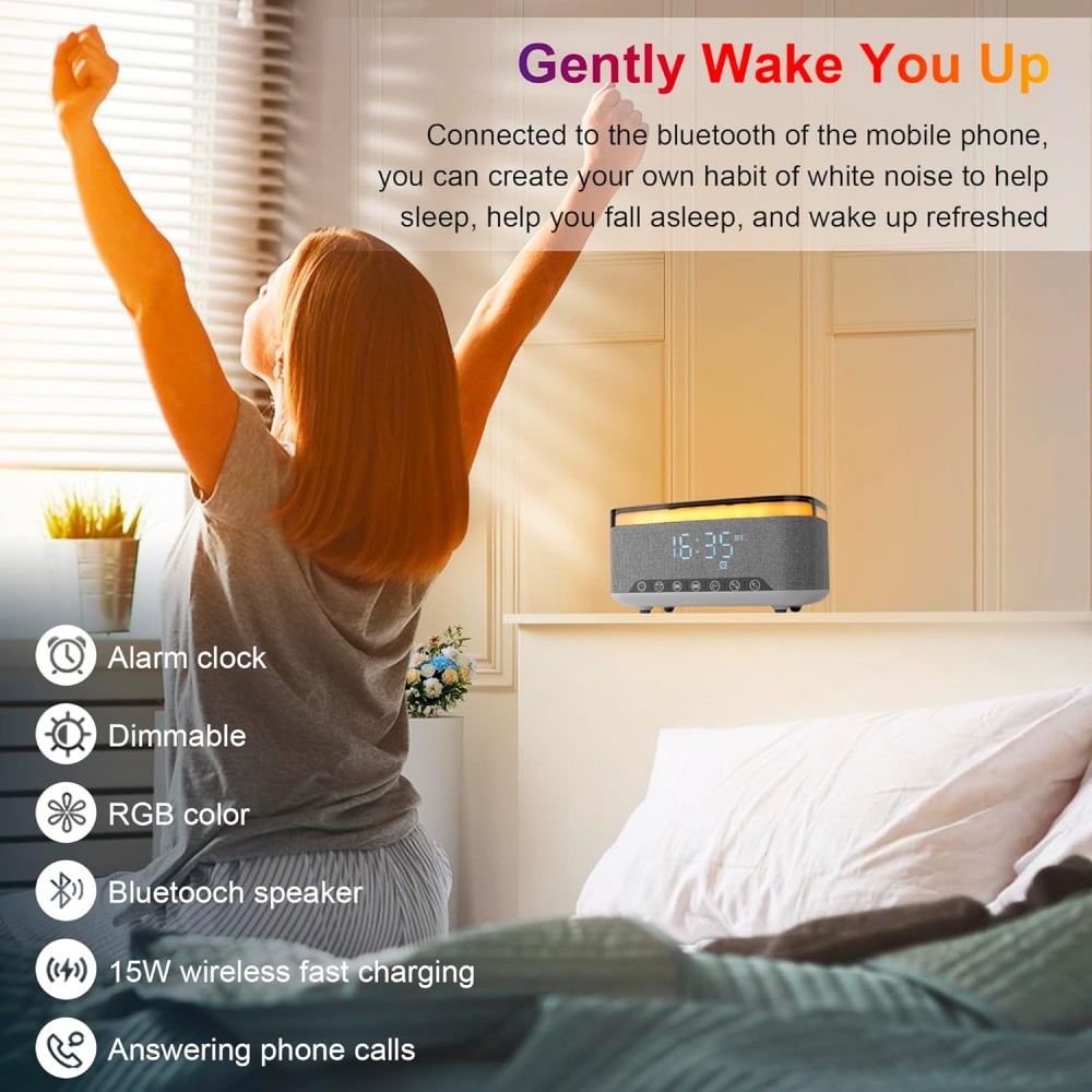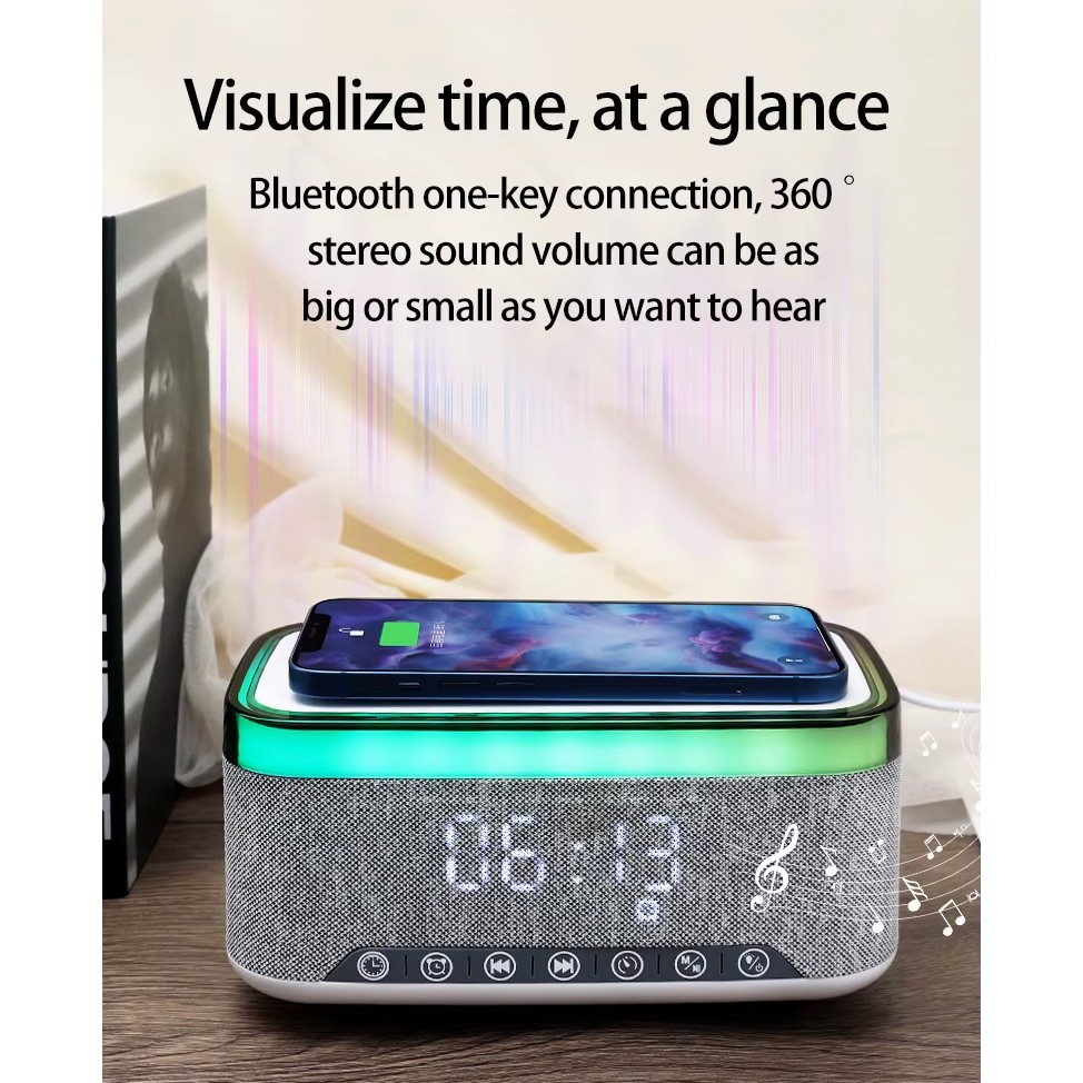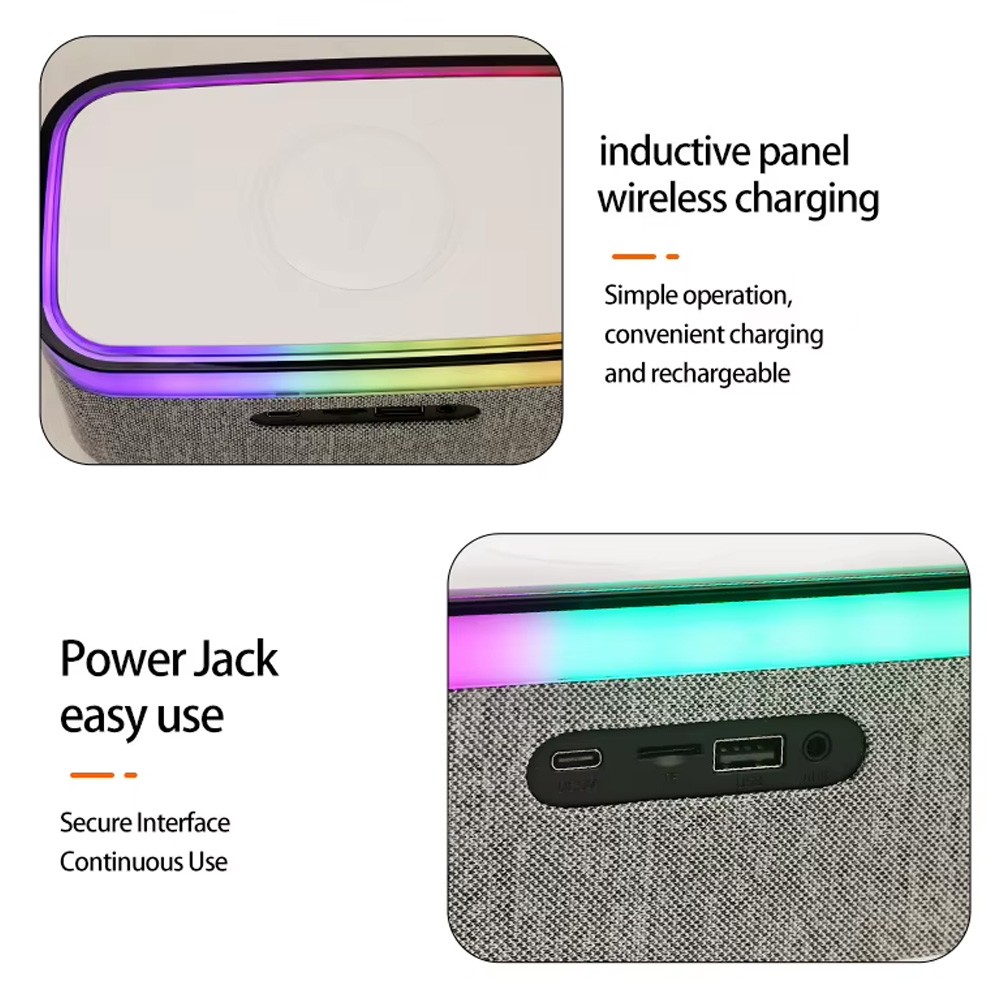 Funkcije: Bluetooth, 7 režima boja, tajmer, alarm, bežično punjenje, RGB osvetljenje, AUX, USB, TF kartica, FM radio