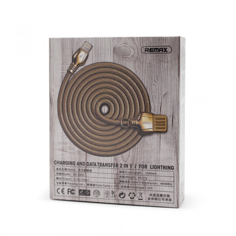 Data kabl REMAX King RC-063i za iPhone lightning zlatni 1m prodaja po AKCIJSKOJ ceni 1000 dinara u Beogradu i Srbiji. Originalno fabričko pakovanje Data kabl REMAX King RC-063i za iPhone lightning zlatni 1m. Isporuka po Srbiji za 24h. Poručite telefonom ili online - telekoplus.com