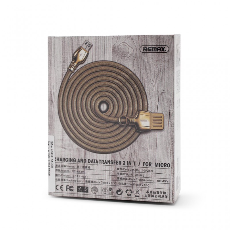 Data kabl REMAX King RC-063m micro USB zlatni 1m prodaja po AKCIJSKOJ ceni 1000 dinara u Beogradu i Srbiji. Originalno fabričko pakovanje Data kabl REMAX King RC-063m micro USB zlatni 1m. Isporuka po Srbiji za 24h. Poručite telefonom ili online - telekoplus.com