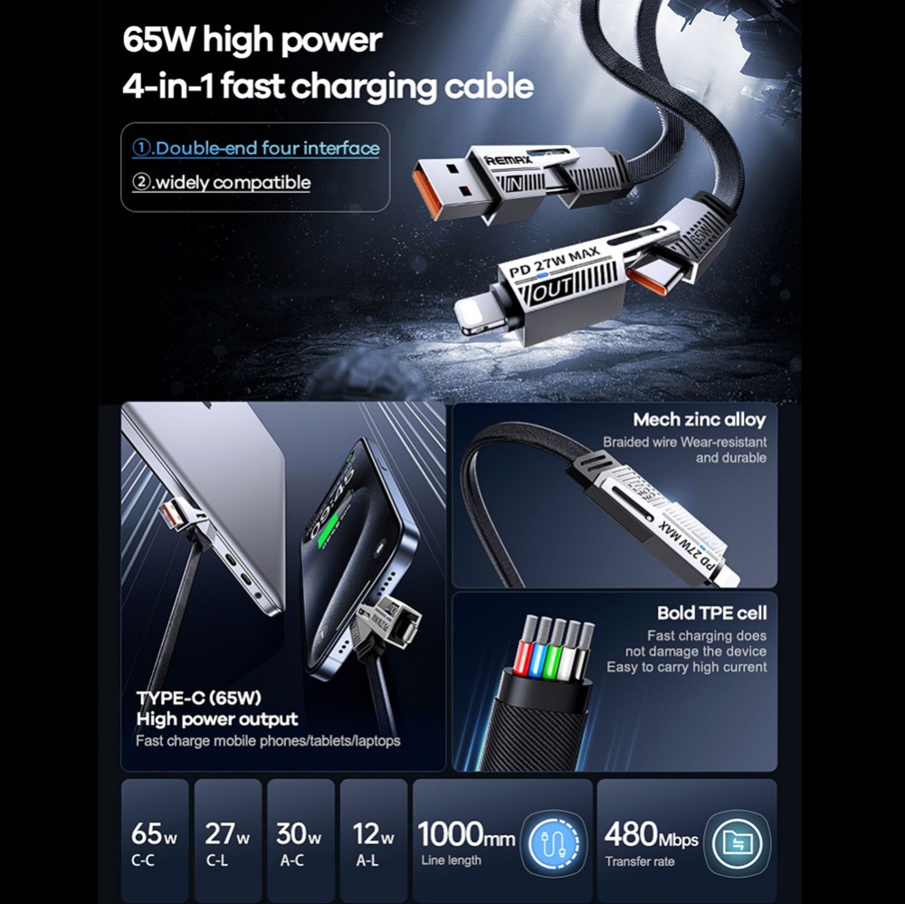 Data kabl REMAX RC-C189 65W 4-in-1 Fast Charging crni 1m