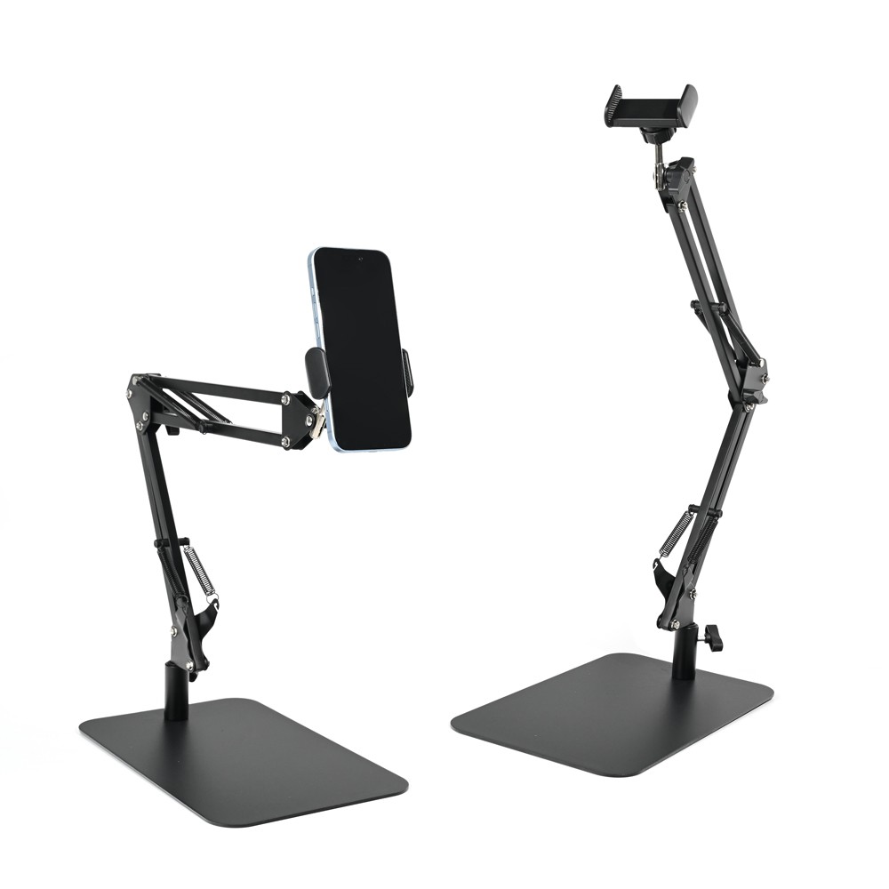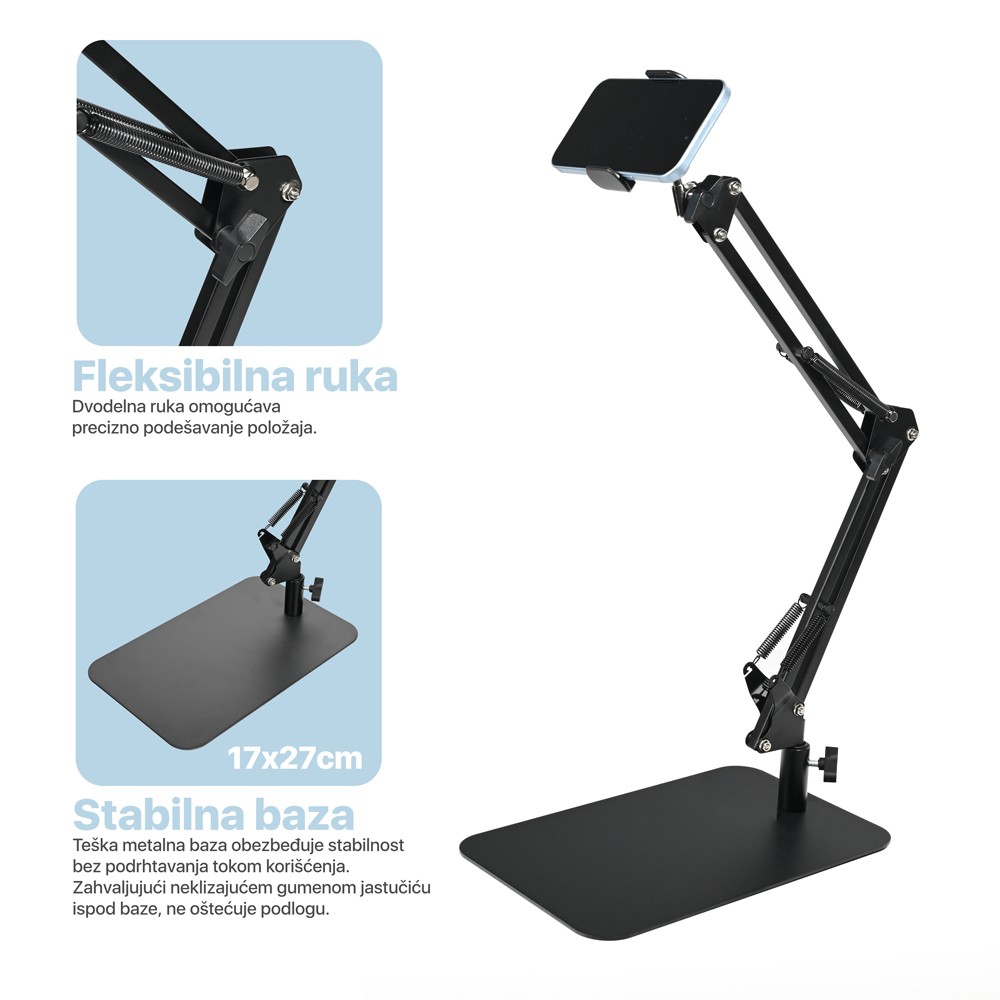 Ovaj višenamenski stalak je dizajniran za stabilnost i fleksibilnost, sa teškom kvadratnom metalnom bazom i ojačanom aluminijumskom rukom koja pruža izuzetnu izdržljivost i otpornost na rđu. Dvodelna fleksibilna ruka omogućava lako podešavanje uređaja u savršen ugao gledanja, dok 360° rotirajuća stega za telefon obezbeđuje idealno pozicioniranje za video pozive, snimanje i online sastanke.