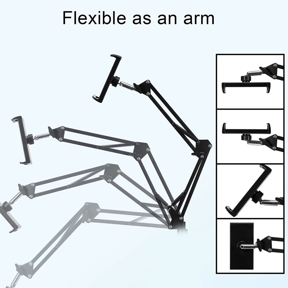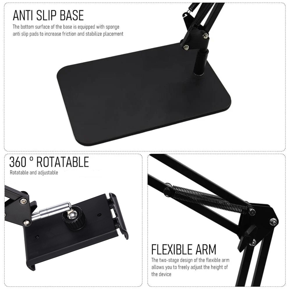 Ovaj višenamenski stalak je dizajniran za stabilnost i fleksibilnost, sa teškom kvadratnom metalnom bazom i ojačanom aluminijumskom rukom koja pruža izuzetnu izdržljivost i otpornost na rđu. Dvodelna fleksibilna ruka omogućava lako podešavanje uređaja u savršen ugao gledanja, dok 360° rotirajuća stega za telefon obezbeđuje idealno pozicioniranje za video pozive, snimanje i online sastanke.