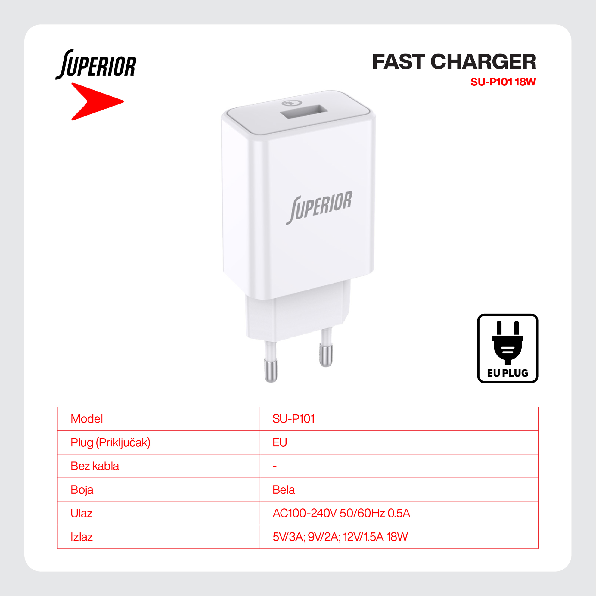 Kuciste punjaca Superior SU-P101 Fast QC3.0 18W 3A belo prodaja po AKCIJSKOJ ceni 2000 dinara u Beogradu i Srbiji. Originalno fabričko pakovanje Kuciste punjaca Superior SU-P101 Fast QC3.0 18W 3A belo. Isporuka po Srbiji za 24h. Poručite telefonom ili online - telekoplus.com