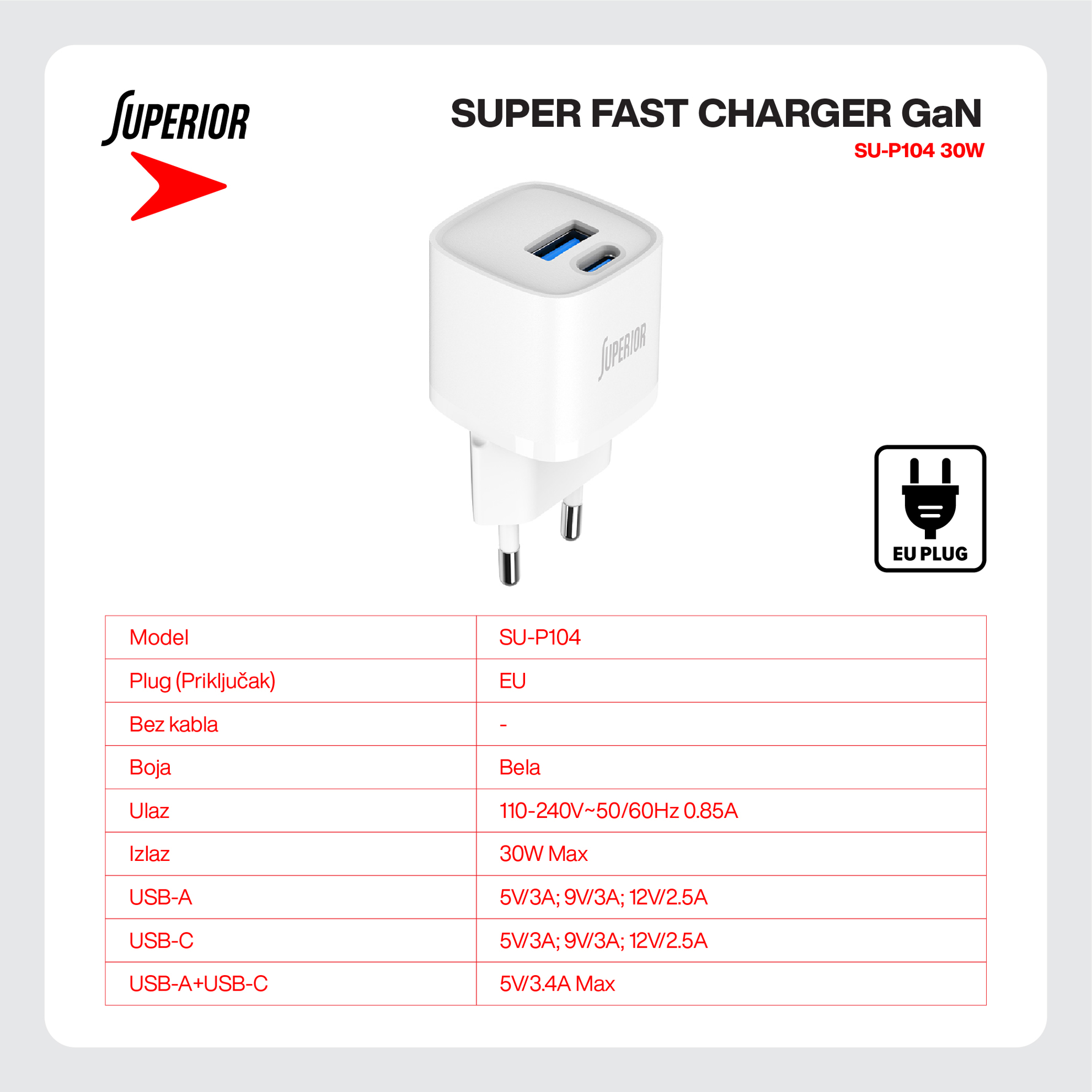 Kuciste punjaca Superior SU-P104 30W GaN Super Fast USB A QC3.0+Type C belo prodaja po AKCIJSKOJ ceni 2000 dinara u Beogradu i Srbiji. Originalno fabričko pakovanje Kuciste punjaca Superior SU-P104 30W GaN Super Fast USB A QC3.0+Type C belo. Isporuka po Srbiji za 24h. Poručite telefonom ili online - telekoplus.com