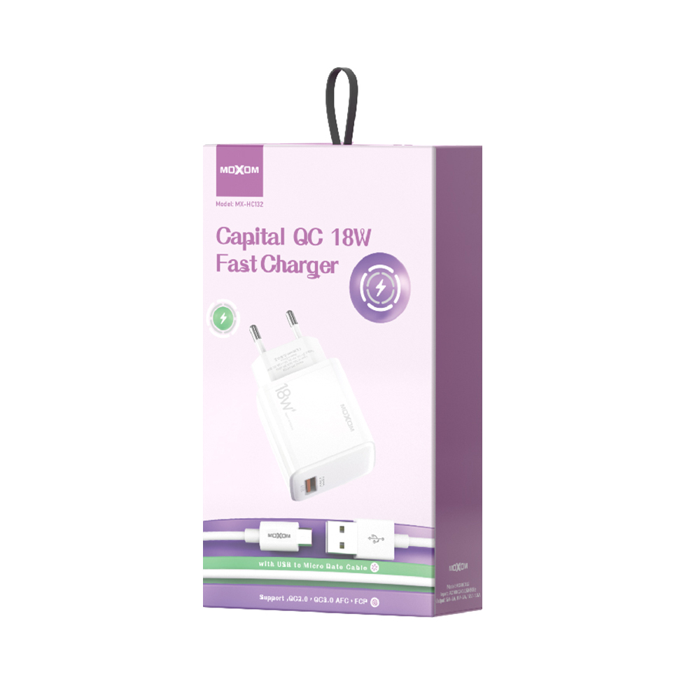 Kucni punjac Moxom MX-HC132 3A/18W Micro beli prodaja po AKCIJSKOJ ceni 2000 dinara u Beogradu i Srbiji. Originalno fabričko pakovanje Kucni punjac Moxom MX-HC132 3A/18W Micro beli. Isporuka po Srbiji za 24h. Poručite telefonom ili online - telekoplus.com