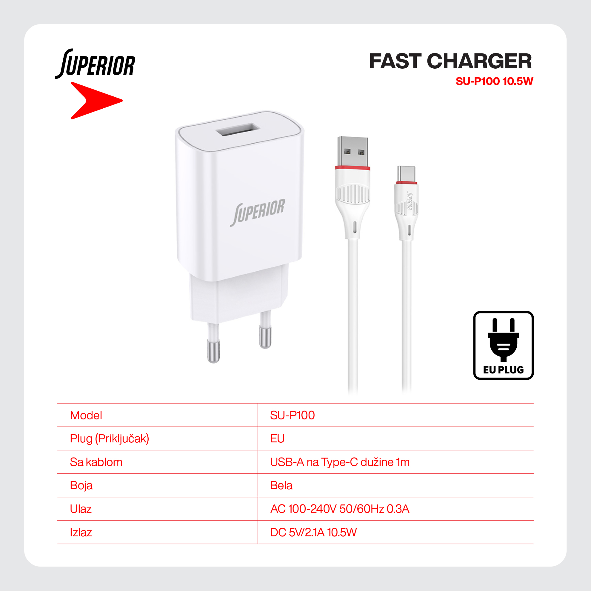 Kucni punjac Superior SU-P100 10.5W 2.1A Type C beli prodaja po AKCIJSKOJ ceni 2000 dinara u Beogradu i Srbiji. Originalno fabričko pakovanje Kucni punjac Superior SU-P100 10.5W 2.1A Type C beli. Isporuka po Srbiji za 24h. Poručite telefonom ili online - telekoplus.com