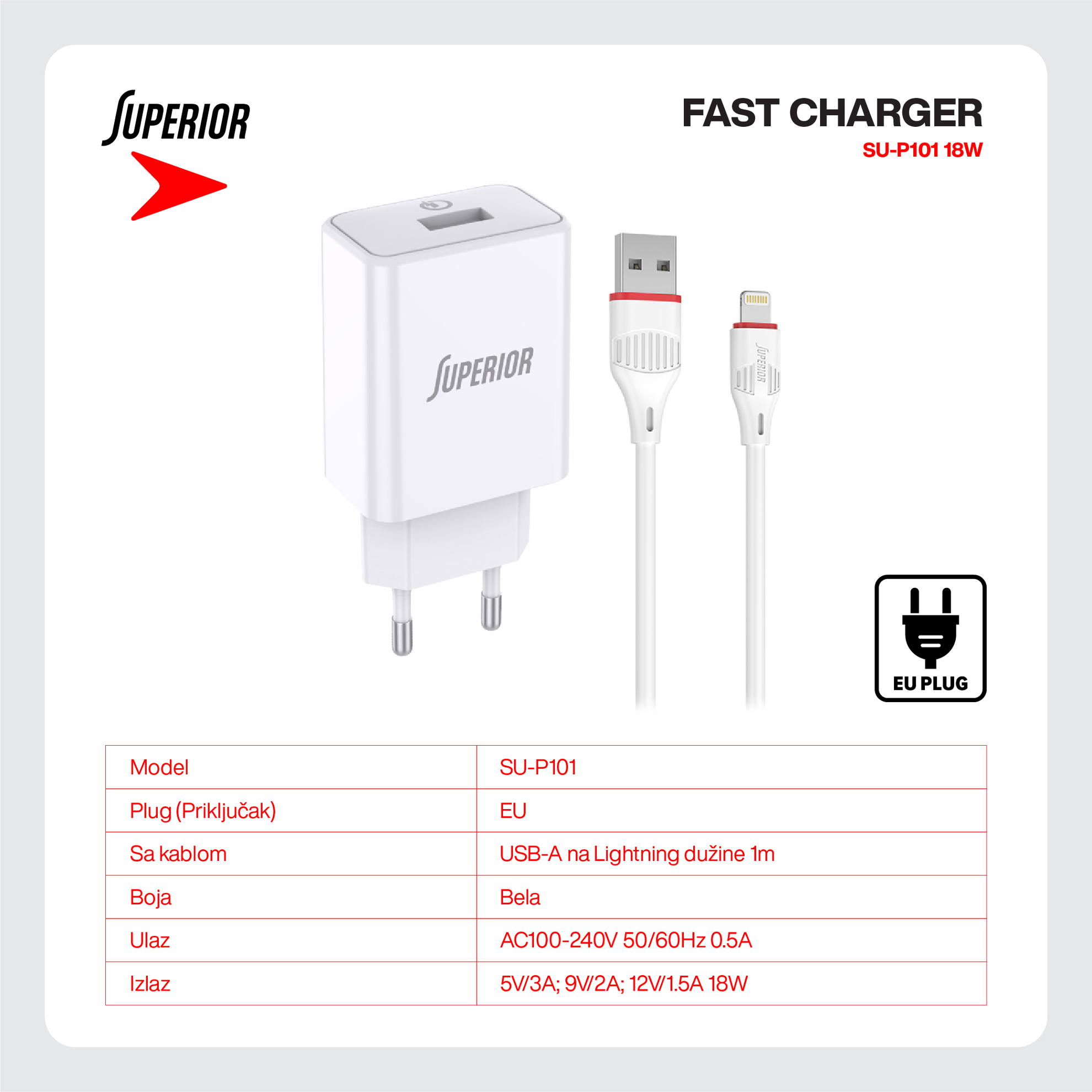 Kucni punjac Superior SU-P101 Fast QC3.0 18W 3A Lightning beli