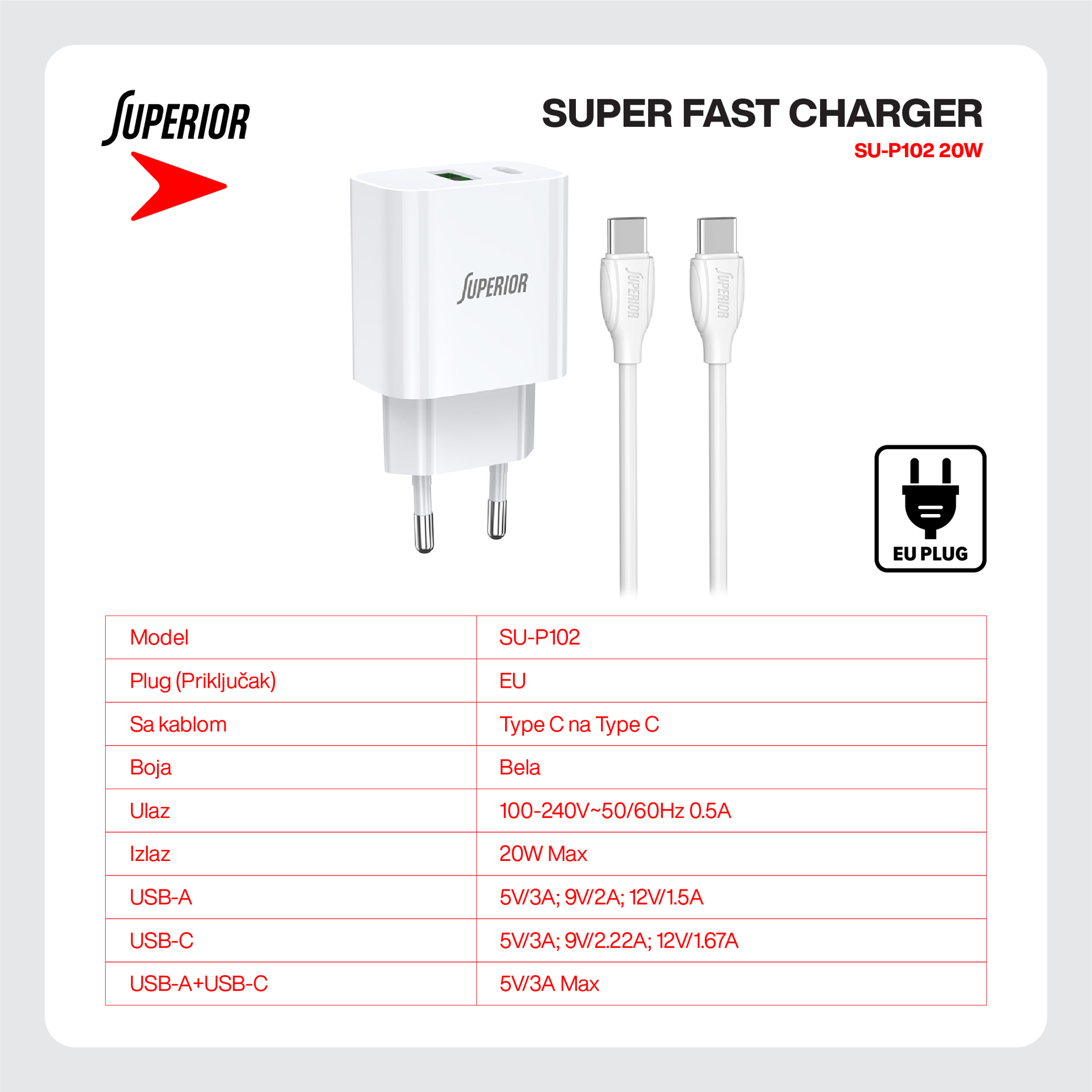 Kucni punjac Superior SU-P102 20W Super Fast USB A QC3.0+Type C sa Type C na Type C kablom beli (CERT) prodaja po AKCIJSKOJ ceni 5000 dinara u Beogradu i Srbiji. Originalno fabričko pakovanje Kucni punjac Superior SU-P102 20W Super Fast USB A QC3.0+Type C sa Type C na Type C kablom beli (CERT). Isporuka po Srbiji za 24h. Poručite telefonom ili online - telekoplus.com