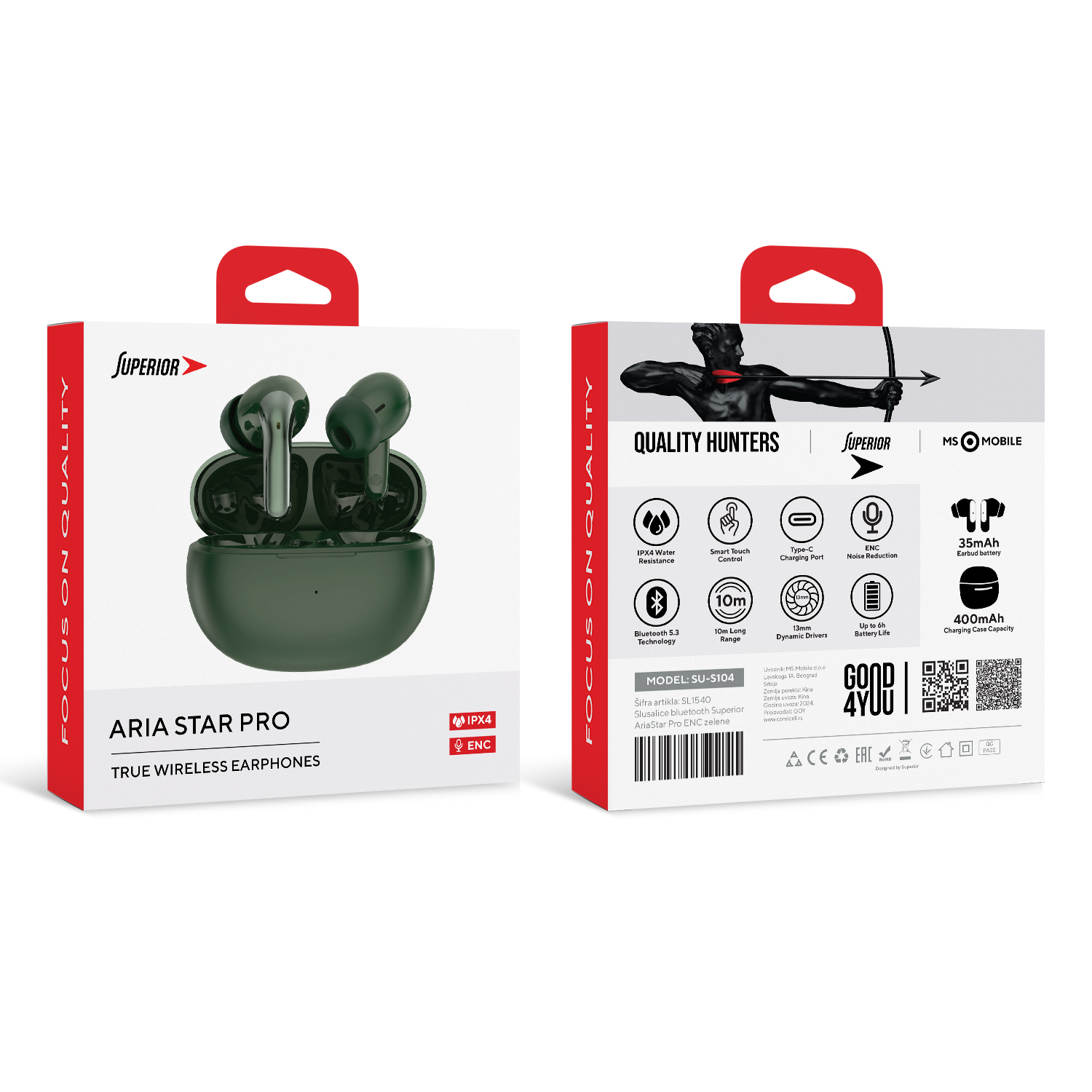 Slusalice bluetooth Superior AriaStar Pro ENC zelene prodaja po AKCIJSKOJ ceni 5000 dinara u Beogradu i Srbiji. Originalno fabričko pakovanje Slusalice bluetooth Superior AriaStar Pro ENC zelene. Isporuka po Srbiji za 24h. Poručite telefonom ili online - telekoplus.com