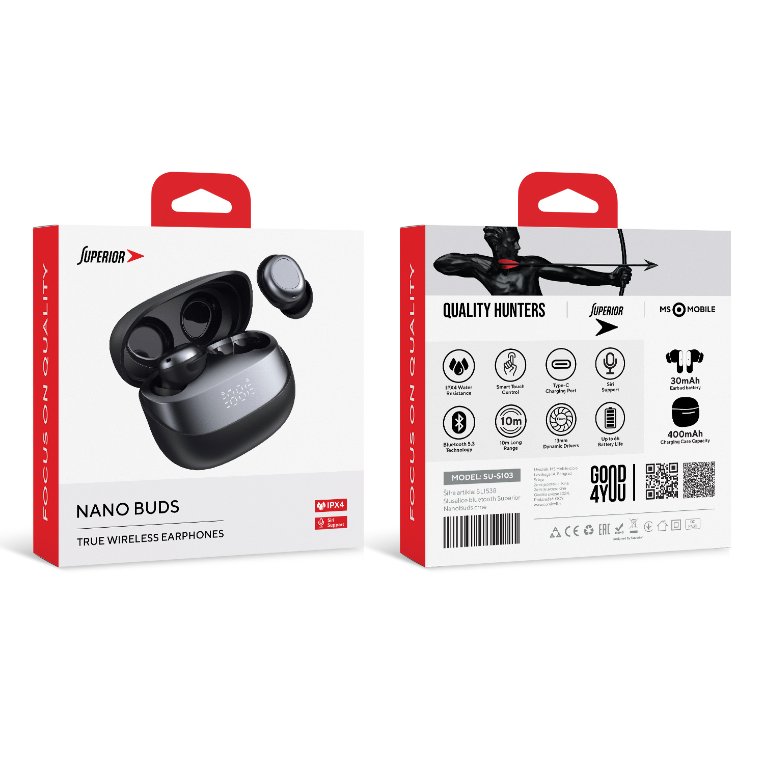 Slusalice bluetooth Superior NanoBuds crne prodaja po AKCIJSKOJ ceni 5000 dinara u Beogradu i Srbiji. Originalno fabričko pakovanje Slusalice bluetooth Superior NanoBuds crne. Isporuka po Srbiji za 24h. Poručite telefonom ili online - telekoplus.com