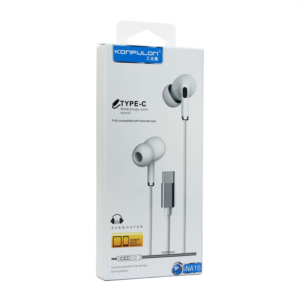 Slusalice KONFULON INA16 Type C bele prodaja po AKCIJSKOJ ceni 3000 dinara u Beogradu i Srbiji. Originalno fabričko pakovanje Slusalice KONFULON INA16 Type C bele. Isporuka po Srbiji za 24h. Poručite telefonom ili online - telekoplus.com