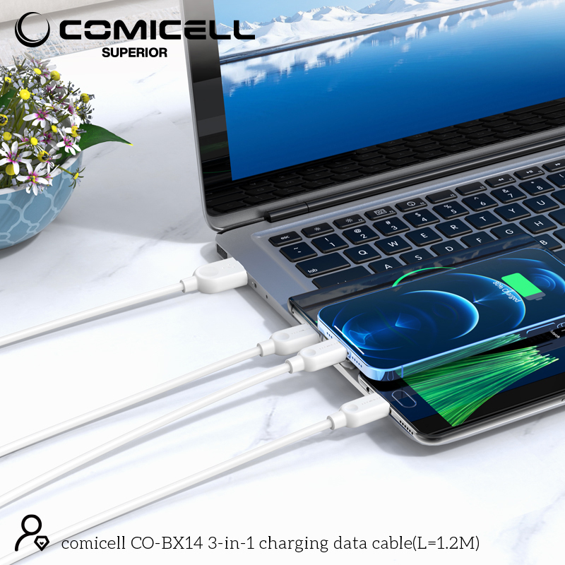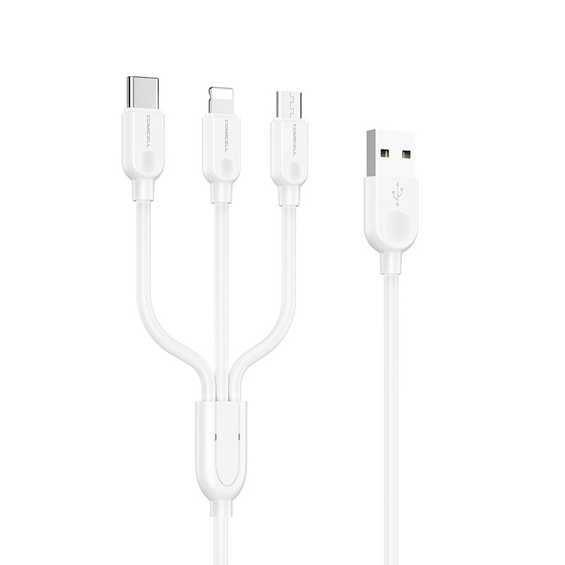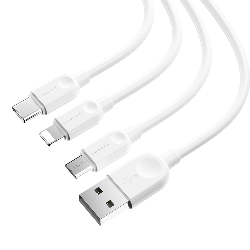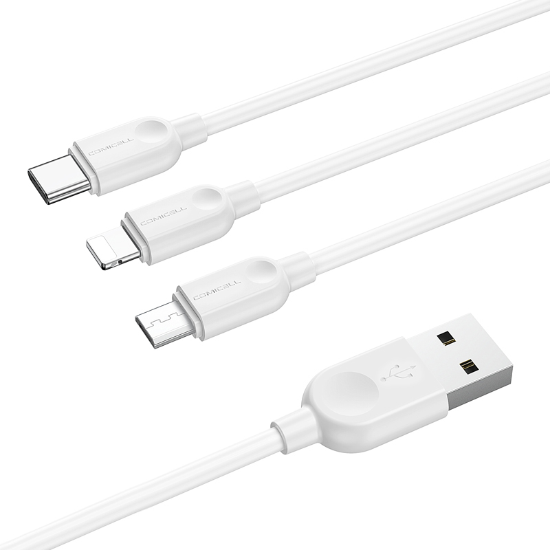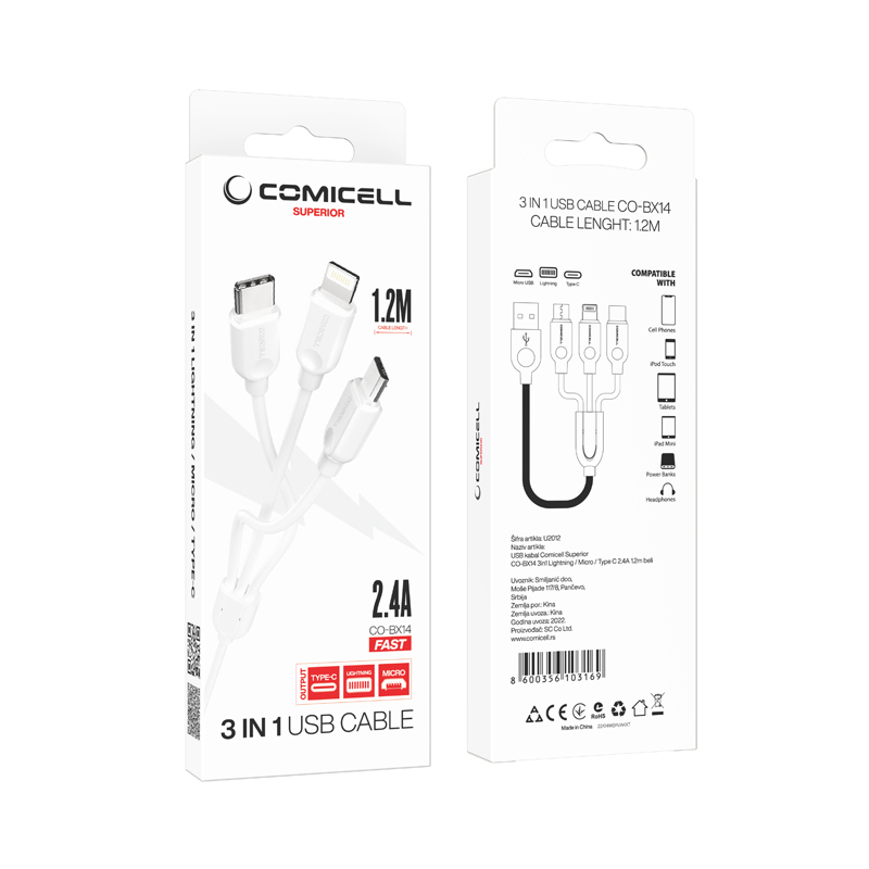 USB data kabal Comicell Superior CO-BX14 3in1 lightning/micro/type C 2.4A 1.2m beli prodaja po AKCIJSKOJ ceni 1000 dinara u Beogradu i Srbiji. Originalno fabričko pakovanje USB data kabal Comicell Superior CO-BX14 3in1 lightning/micro/type C 2.4A 1.2m beli. Isporuka po Srbiji za 24h. Poručite telefonom ili online - telekoplus.com