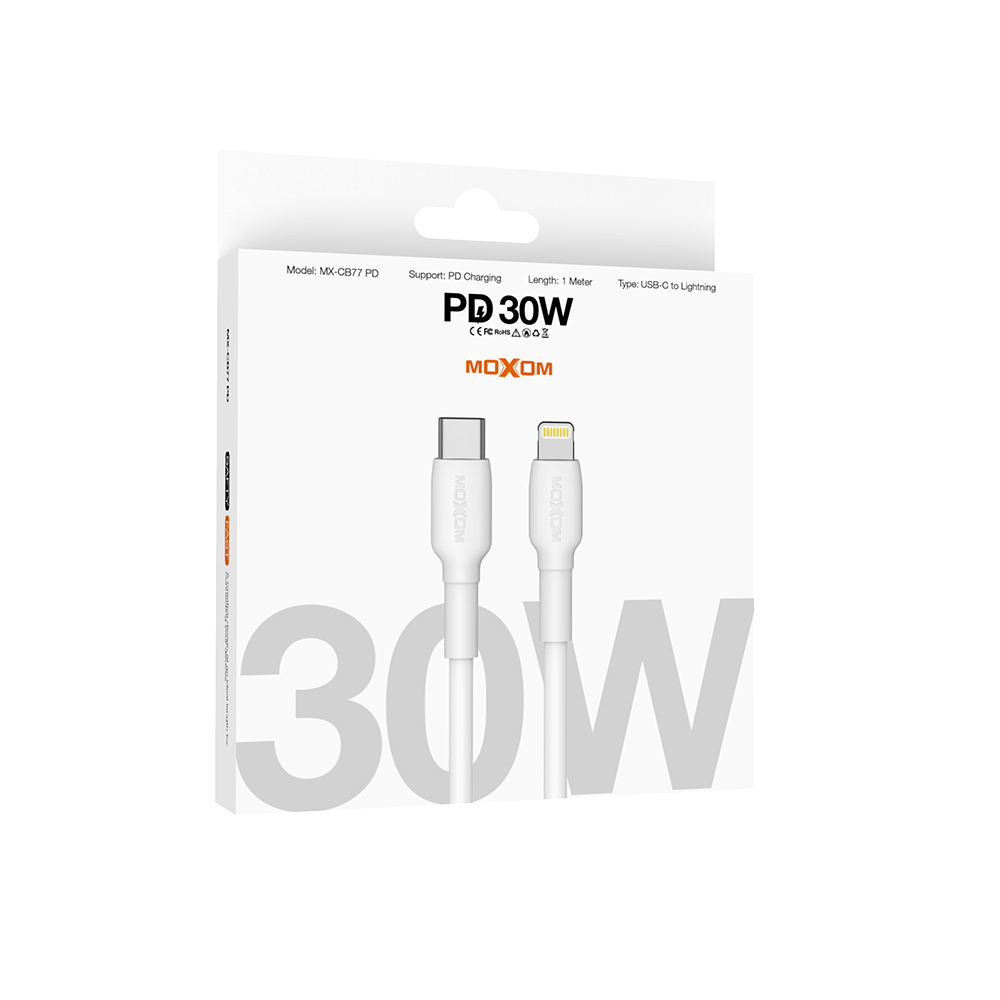 USB data kabal MOXOM MX-CB77 PD 30W Type-C na Lightning beli prodaja po AKCIJSKOJ ceni 1500 dinara u Beogradu i Srbiji. Originalno fabričko pakovanje USB data kabal MOXOM MX-CB77 PD 30W Type-C na Lightning beli. Isporuka po Srbiji za 24h. Poručite telefonom ili online - telekoplus.com