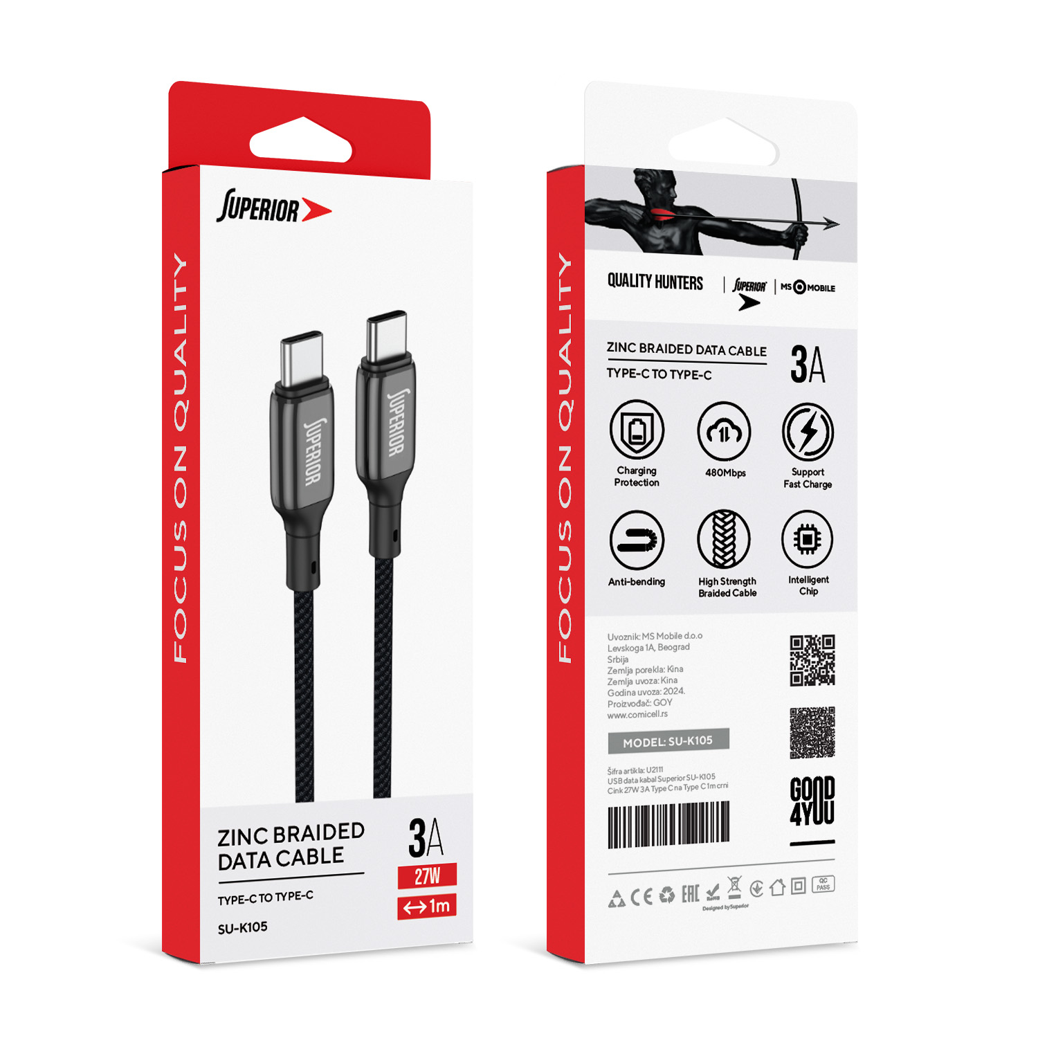 USB data kabal Superior SU-K105 Cink 60W 3A Type C na Type C 1m crni prodaja po AKCIJSKOJ ceni 1500 dinara u Beogradu i Srbiji. Originalno fabričko pakovanje USB data kabal Superior SU-K105 Cink 60W 3A Type C na Type C 1m crni. Isporuka po Srbiji za 24h. Poručite telefonom ili online - telekoplus.com