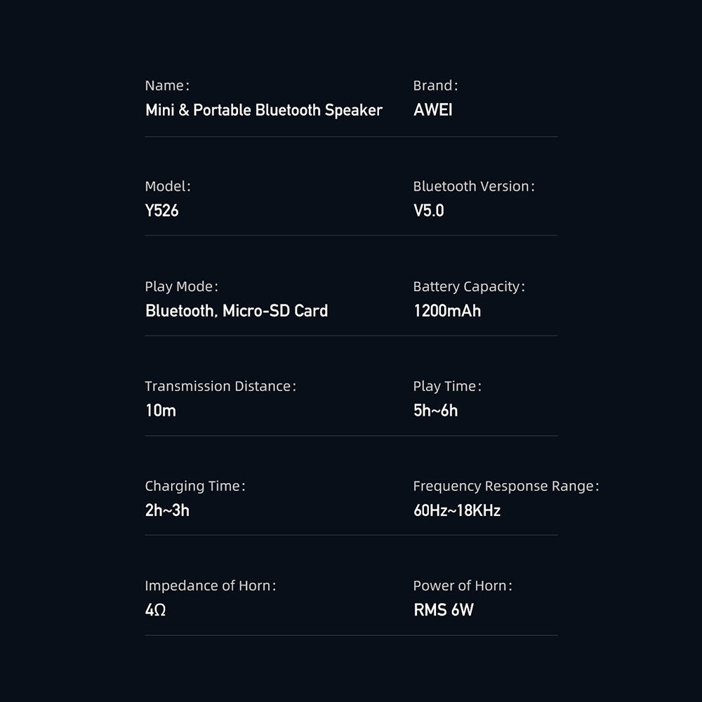 Zvucnik bluetooth AWEI Y526 crni prodaja po AKCIJSKOJ ceni 10000 dinara u Beogradu i Srbiji. Originalno fabričko pakovanje Zvucnik bluetooth AWEI Y526 crni. Isporuka po Srbiji za 24h. Poručite telefonom ili online - telekoplus.com